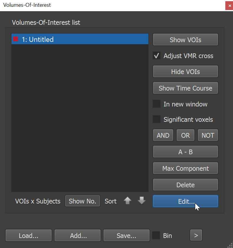 The resultung VOI will be called "Untitled". By selecting the VOI in the "Volumes-Of-Interest list" and clicking on "Edit" one can change the name and the color of the selected VOI.