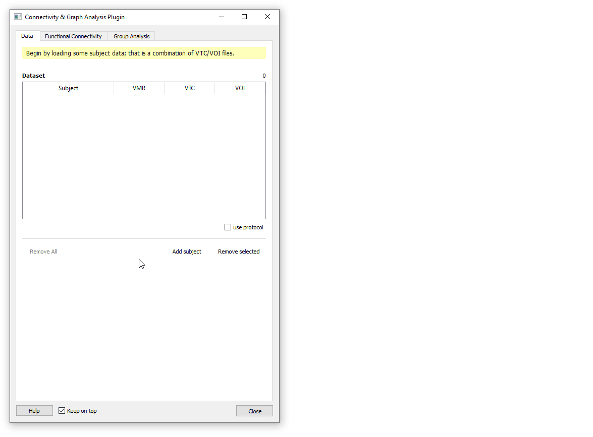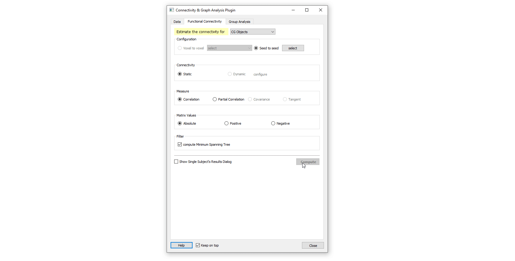 As soon as, the data have been loaded into memory, you are able to navigate and scroll through the available options in the “Functional Connectivity” tab. Here, you will find all the necessary settings to conduct a connectivity study.
