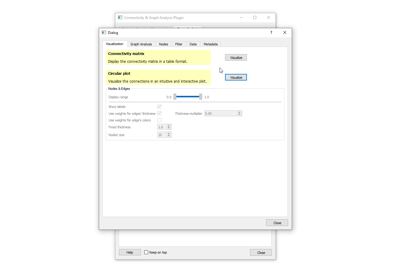 The backbone of the plugin. The connectivity matrix is translated into a graph, and thus, you can compute and extract the different graph theoretical features of a graph. Some features produce only a scalar result, such as the “Global Effieciency”, and it’s displayed inplace, within the same window. However, most of the other features, produce either arrays or matrices, which you will able to inspect their plots, using the associated “inspect” button.