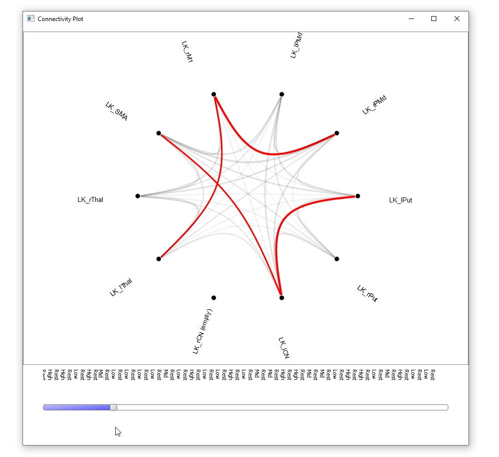 This example demonstrates how a dataset with a supported protocol is handled, with the conditions shown above the sliding bar. The triggers are represent with their name (just plain text) and no network is plotted. Also, notice the interactive features, such as filtering the plots when the mouse moves over a VOI.